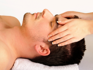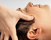 массаж лобной части головы и воротниковой зоны, массаж проводится через одежду, в положении сидя.